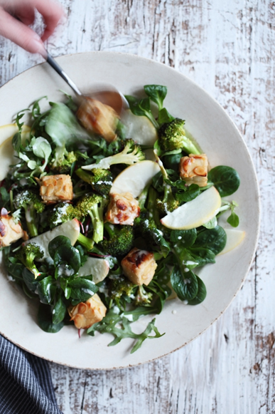 Bei diesem vegetarischen Salat, den ich ich Florette entwickelt habe, passen die Röstaromen des Broccolis wunderbar zu dem mildem Feldsalat und dem süßem, knackigen Apfel. Der Rukola gibt etwas Schärfe und die warmen Mandeltofuwürfel runden das Ganze ab.